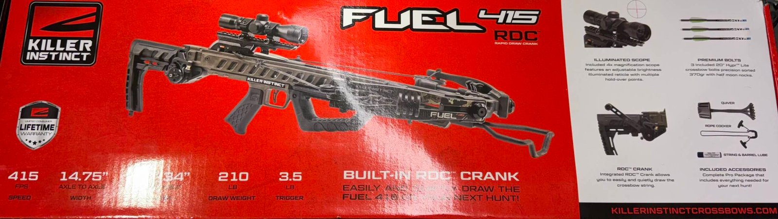 The Killer Instinct Fuel 415 Crossbow is an ambidextrous bow hunting weapon made of aluminum. It features a Multi-Color design and comes with an RDC Scope for precision aiming. Ideal for outdoor sports enthusiasts looking for a high-performing crossbow. new and opened box ready for action